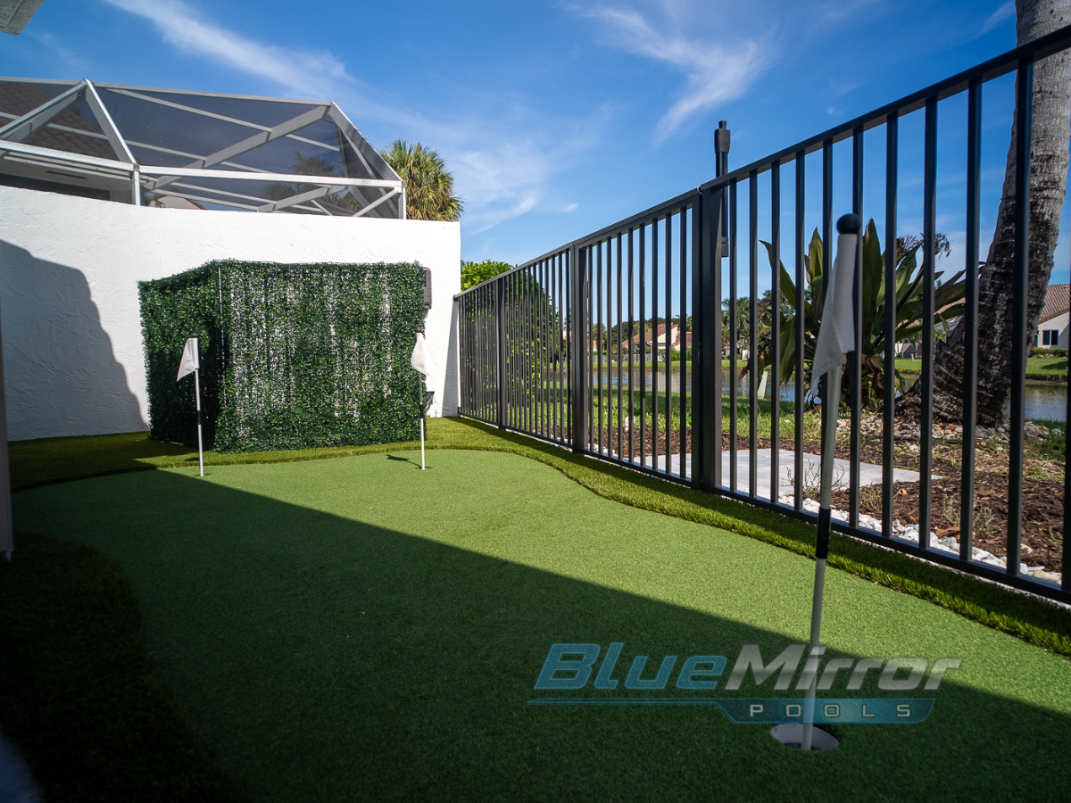 This is a backyard makeover dream come true! We did it all from an elegant pool, to cool water features and nice little putting green to relax & work on the golf game!